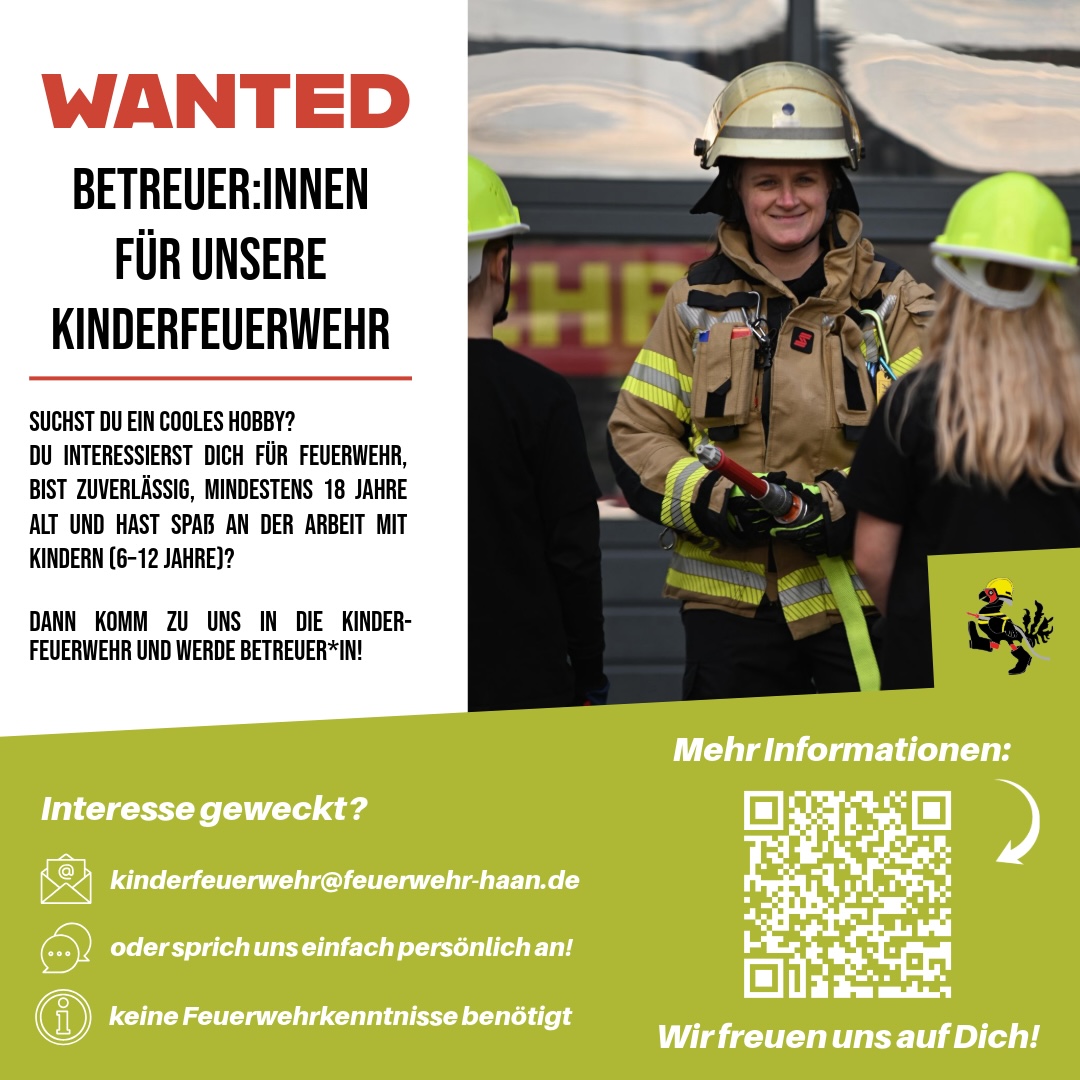 Wir suchen auch noch Unterstützung für unser Betreuerteam. Du interessierst Dich für das Thema Feuerwehr? Du bist zuverlässig und motiviert? Du bist mindestens 18 Jahre alt? Du arbeitest gern mit Kindern im Alter von sechs bis zwölf Jahren? Du bringst die Bereitschaft zur Aus- und Fortbildung mit? Dann melde Dich gern bei uns unter kinderfeuerwehr@feuerwehr-haan.de